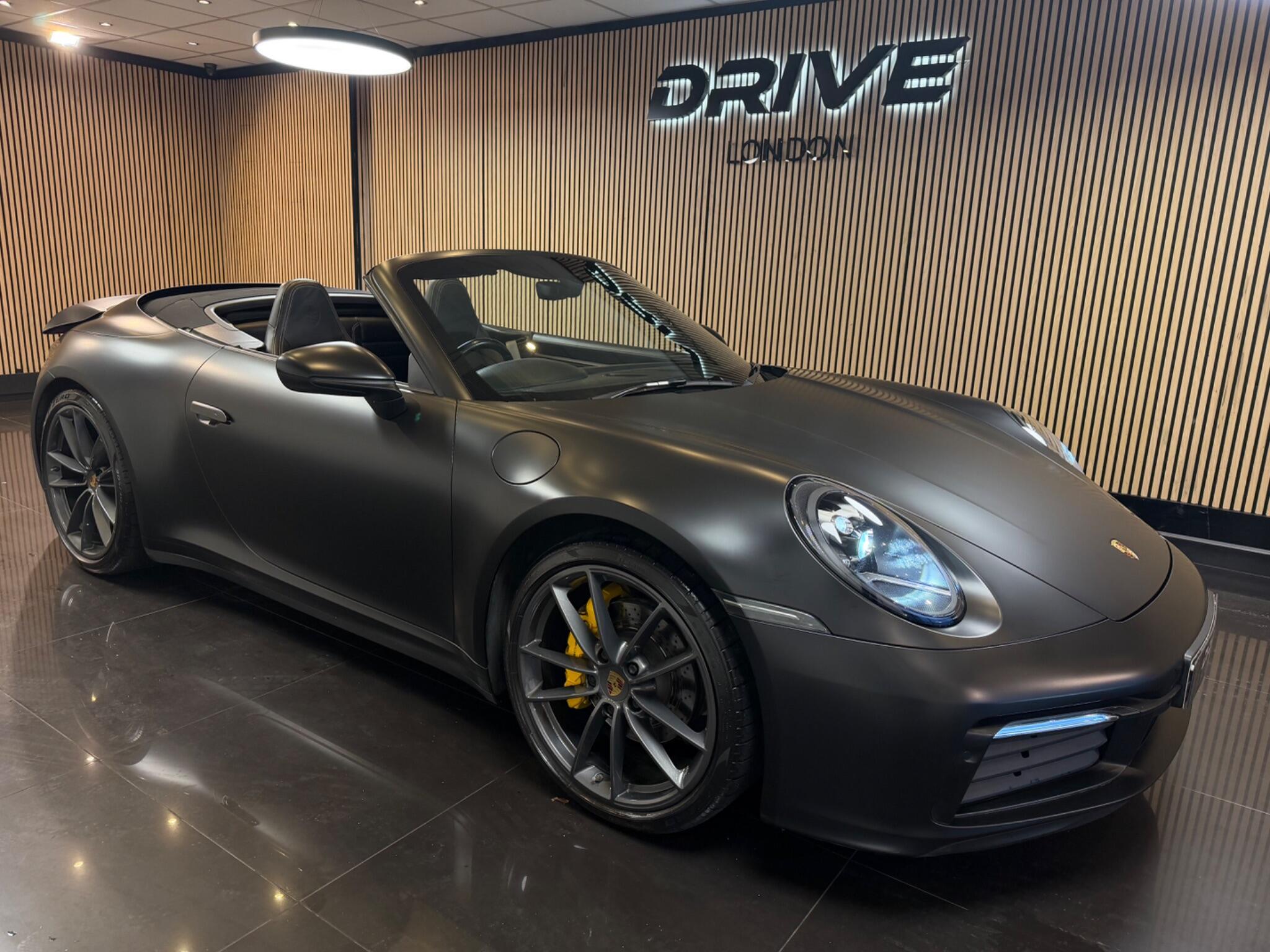 Porsche 911 3.0T 992 Carrera 4 PDK 4WD finished in a brand new Satin Black wrap, this stunning example has serious road presence and looks incredible in the showroom. Featuring Carrera alloy wheels with yellow Porsche brake calipers, LED headlights with signature daytime running lights, full-width rear LED light bar,, electric deployable rear spoiler, black leather heated seats, electric folding mirrors, Porsche widescreen navigation, fully digital driver display, centre touchscreen infotainment system, dual-zone climate control, heated electric memory seats, paddle shift PDK gearbox, keyless start, cruise control, parking sensors, reverse camera and intelligent wet drive system for all-season confidence. A superbly presented 992 that is priced to sell. Delivery available, finance available, PX welcome.