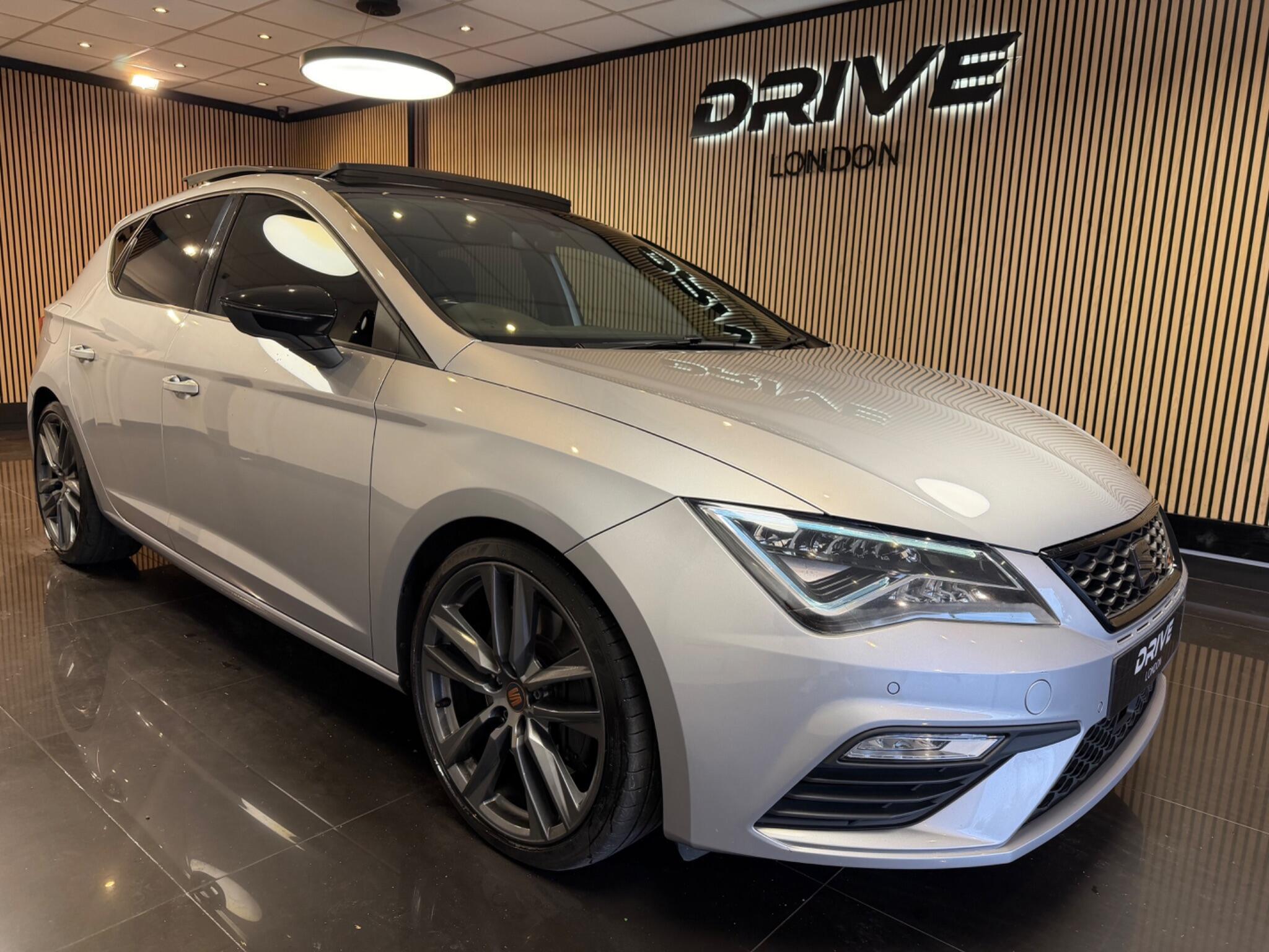 SEAT Leon 2.0 TSI Cupra 290 DSG Euro 6 (s/s) 5dr finished in silver, ULEZ compliant and automatic DSG gearbox. This sporty example comes with full LED headlights and LED rear lights, front and rear parking sensors, diamond-cut alloy wheels, black exterior styling, dual exhaust system, digital cockpit display, touchscreen infotainment system with satellite navigation, Bluetooth connectivity, DAB radio, media connectivity, multifunction flat-bottom steering wheel with paddle shift, cruise control, dual-zone climate control, drive mode selection, ambient interior lighting, Cupra sports seats in part leather/Alcantara, electric windows and mirrors, ISOFIX rear seats and start/stop technology. A fantastic performance hatchback offering sharp looks and superb driving dynamics. Priced to sell, part exchange welcome, finance available